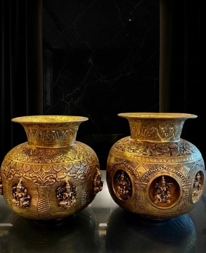 WriThe Ashtalakshmi Brass Kalash is a profound embodiment of spiritual grandeur and exceptional artisanal skill. Each vessel serves as a sacred tribute to the eight manifestations of Goddess Lakshmi—the Ashtalakshmi—whose divine forms are intricately sculpted in relief to bestow prosperity, abundance, and auspiciousness upon their surroundings. The warm, golden luster of the high-quality brass is perfectly complemented by the meticulous craftsmanship, where traditional motifs and delicate engravings dance across the curved surface, creating a captivating interplay of light and shadow. More than mere home decor, these Kalashas are timeless heirlooms that bridge the gap between ancient Vedic tradition and sophisticated modern luxury, anchoring any space with a sense of reverence, history, and profound aesthetic elegance.te something...